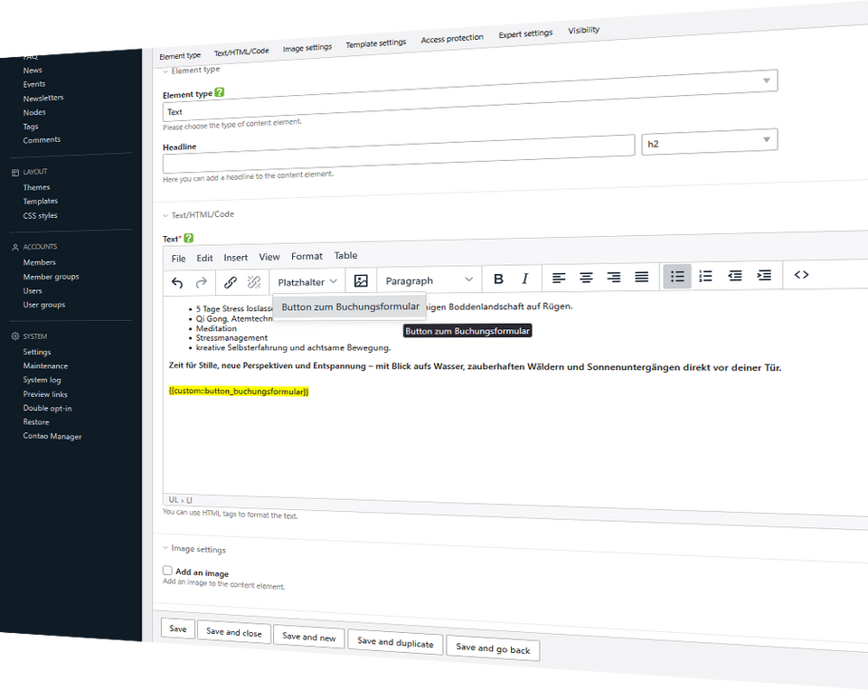 Damit können kurze Texte, z.B. mit einem bestimmten Namen oder einem Datum für ein Event, Buttons zu einer zentralen Seite genauso wie komplette Texte mit Bildern gemeint sein. Der Vorteil dabei liegt klar auf der Hand: Nachdem der Platzhalter einmal zentral angelegt wurde, lässt er sich beliebig als Custom Insert Tag in Texten oder Frontend-Modulen platzieren und vermeidet somit Fehler und Copy & Paste.